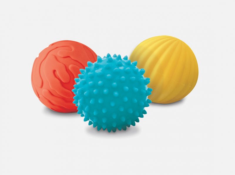 Ce coffret contient  3 petites balles nervurées. Adaptés pour les petits à partir de 6 mois, ces 3 balles sensorielles aux couleurs vives et chatoyantes attirent l’attention de bébé qui sera aussi intrigué par leurs différentes textures.