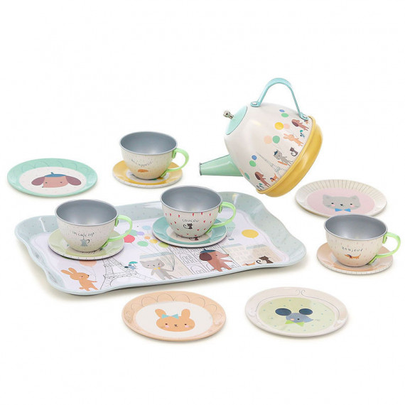 Vilac a conçu cette dinette musicale en métal tout en douceur et poésie, pour les enfants à partir de 3 ans. Une théière magique joue une douce mélodie quand on la penche pour servir le thé comme les grands.