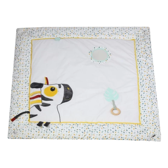 De dimension 100x100cm, ce tapis propose 20 activités sensorielles à bébé : miroir, hochet, pouet, clochette, et papier bruissant.